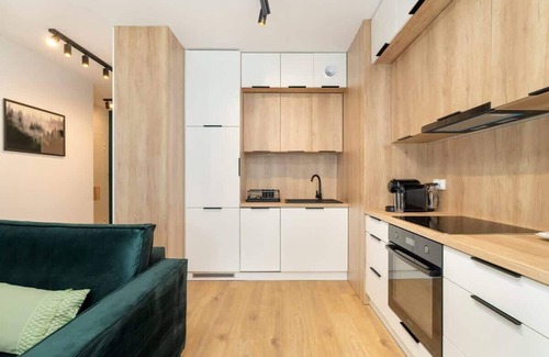 The studio apartment, located on the first floor, captivates with its brightness and elegance, emphasized by subtle wooden elements. The space was designed with the comfort of four people in mind, offering two beds in the bedroom area on a king-size double bed and on the sofa. The kitchenette has been equipped with modern amenities, such as an induction hob, oven, dishwasher and coffee maker, which allows you to prepare meals in the comfort of your home. The apartment has a balcony with garden furniture, perfect for relaxing with your morning coffee. The bathroom has been designed with attention to every detail, offering a shower, fresh towels and a special set of cosmetics. Additionally, the apartment is equipped with a washing machine, which is extremely convenient, especially for longer stays. Fast WiFi is available in all rooms, allowing both work and entertainment. You can also use a flat-screen TV equipped with the SmartTV + function, which gives access to a wide range of multimedia entertainment. There is a parking space in the underground garage. This is the perfect place for a relaxing stay in an elegant and modern environment.