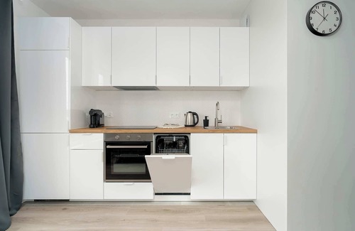 The comfortable and spacious apartment can accommodate 2 adults and 2 children, because the sofa bed in the living room is only suitable for children (up to 150 cm tall). The apartment has an area of 34 m2 and consists of a living room, kitchenette, bedroom, bathroom and balcony. The living room has a TV with SmartTV function and a large table with chairs. The bedroom has a comfortable double bed. The kitchenette is equipped with all the necessary kitchen utensils and appliances. The bathroom has a shower cabin and a washing machine. The bright interior of the apartment and high-quality equipment guarantee a comfortable stay. The apartment has a balcony equipped with garden furniture, which is an ideal place to relax in the fresh air. Guests have a private parking space in the underground garage.