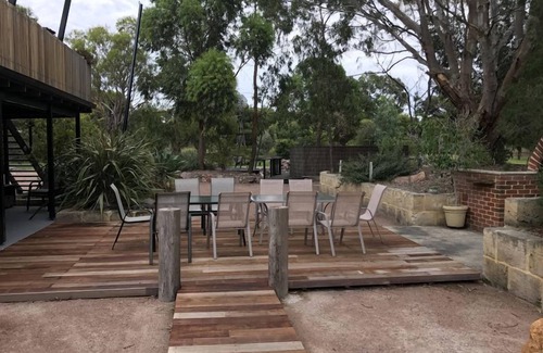 - Downstairs House has 3 large bedrooms (1 queen bed),(1 double and 1 single) (the other 3 single beds) very large open area with lounge, fully equipped kitchen/dining. Airconditioned, Tile fire, Sweep Fans, Oil heaters. Bathroom with separate toilet. Games room attached, loads of books, videos and DVD's for your entertainment. There are 2 bbq's 1 gas and 1 woodfire, outdoor settings, Patio and upstairs balcony over looking a lake.