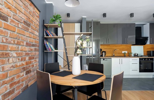 The stylish, carefully designed interior invites you to rest and relax surrounded by warm colors and natural materials. The combination of red brick with modern furnishings gives the space character and coziness, creating an atmosphere conducive to both quiet evenings and shared moments with the family. The spacious living room with kitchenette serves as the central point of the apartment - there is a large, comfortable corner sofa, a fold-out sofa and a dining table, where you can eat a meal together or spend time with board games. The open kitchen has been equipped with a full set of modern appliances, including an oven, microwave, gas cooker with absorber, dishwasher, capsule coffee maker, fridge with freezer, kettle and washing machine, discreetly placed in the built-in unit. The bedroom has a large wide bed, a spacious wardrobe and a desk, which allows for peaceful work or study. Thoughtful lighting and subdued wall colors create a space conducive to relaxation. The apartment can comfortably accommodate up to five people, offering three separate sleeping places. The living room has a 50-inch Smart TV with cable TV and a fan for warmer days. The bathroom with a bathtub, large mirror and hairdryer has been arranged functionally and neatly, providing everything you need for daily care. The whole is complemented by Wi-Fi access, HDMI cable and elegantly arranged details that make the space take on a homely character. The windows overlook the greenery, and the quiet area is conducive to walks and relaxation. This is a place where it is easy to find your way and feel at ease.