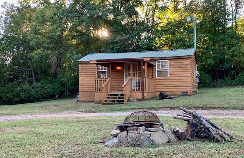 This quaint efficiency cabin sits on 45 acres. Sleeps four people. There is a queen bed and a futon couch that makes into a double bed. This getaway has everything you need and more: one bathroom, microwave oven, small refrigerator, hot plate, kitchen sink, table and chairs, satellite television, small gas grill, fireplace heater, air condition window unit and smart AT&T WiFi television with Blu-ray player. Linens, towels, cookware and tableware provided. The property is beautiful with rolling hills and access to Cane Creek.