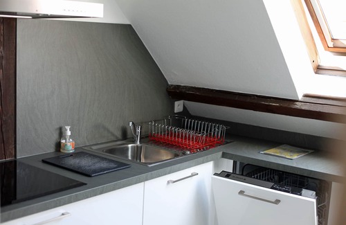 Our recently renovated furnished apartment offers you a spacious living environment ('cathedral' lounge), comfortable, with high-end equipment, at the door of Strasbourg and without parking problems.