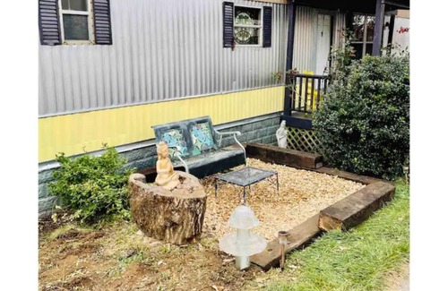 Karma “Plush Pad”is a uniquely refurbished 70’s mobile home in retro-fabulous splendor! In the heart of Floyd , it’s a hop, skip and jump from the Friday night jamboree, fun shops, and restaurants! Pick and grin from your own front porch or cozy up with the record player! Immerse yourself in the Floyd scene, and walk from this convenient space. Although central, Karma delivers on privacy, with comfortable bedrooms, with full baths, large kitchen, & stylish living areas, adorned with art!