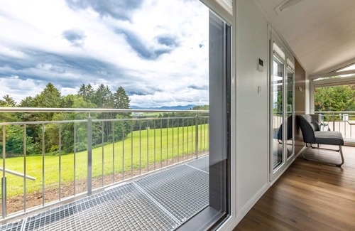 "Tiny Haus", 4-room house 60 m2. Modern and cosy furnishings: 1 double bedroom. 1 room with 2 beds. 1 room with 1 bed. Kitchen-/living room (oven, dishwasher, 4 induction hot plates, toaster, kettle, microwave, electric coffee machine) with dining table, 1 double sofabed (180 cm, length 200 cm), satellite TV. Shower/WC. Floor heating. Balcony. Balcony furniture. Beautiful view of the countryside. Facilities: Internet (WiFi, free). Please note: non-smokers only. 1 pet/ dog allowed. Smoke alarm.