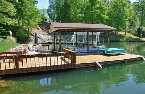 There are two dock patio areas, each with large floater dock with electric and water. One of the docks has a fish cleaning stand. You will have shared use of 5 kayaks, 2 paddle boards, a paddle boat, canoe, tubes, noodles, floats, diving board and sandy beach with firepit. The dock has access by stairs or golf car ramp. A complimentary golf car will also be provided with each rental for your exclusive use (adult drivers only!) for access to the dock and beach.