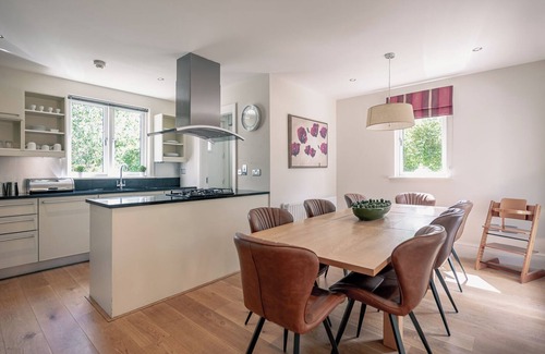 You enter through the front door into a bright, welcoming hallway with a high ceiling. Straight ahead is the open-plan living area, which includes a tidy and well-equipped kitchen, a dining table with seating, and a cosy sitting room with comfortable sofas. The kitchen is fitted with everything you might need during your stay—an American-style fridge freezer, gas hob, electric oven, dishwasher, kettle, toaster and microwave, along with all the necessary crockery, cutlery, cookware and glassware. A separate utility room houses the washing machine and tumble dryer.
