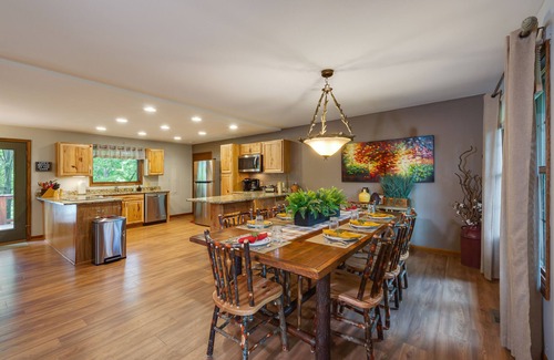 Let this exquisite 4-bedroom, 2-bath vacation rental cabin serve as the ultimate luxury setting for your next lakeside getaway! The wheelchair accessible, pet friendly cabin sleeps 8 and boasts a massive deck, 2 barbecue grills, private dock, fire pit, 2 acres of land, a remodeled interior, and a paved pathway down to the lake. This cabin and property won't disappoint! This lakefront paradise will have you swimming and boating off the dock by day, enjoy cocktails and appetizers on the deck come evening, and closing out the night roasting s’mores around the fire pit! Whether you're planning a relaxing family getaway or a fun gathering with friends, you can't go wrong with this cabin that also provides for your use 2 kayaks, 2 Tower paddle boards, board games, and a corn hole set.