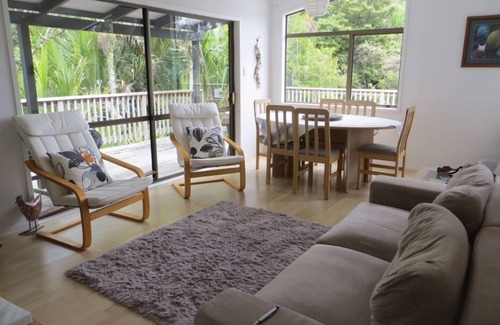 A wonderfully private bach retreat at Baddeleys Beach, close to Matakana village. It is a short walk to Baddeley's Beach only two minutes away (Campbell's Beach 10 min walk). Both beaches have safe playground facilities for children. The 55 minute drive from Auckland Harbour Bridge is soon to be reduced further with the completion of the Puhoi motorway section. An elevated picture frame view through native taraire, puriri and nikau trees looks out into Kawau Bay. An extensive decking area adds to indoor/outdoor living. Native bird life abounds in the adjacent bush: wood pigeon (kereru), tui, bellbird, fantail and kaka. Other birdlife includes quail, pheasants and kookaburra.