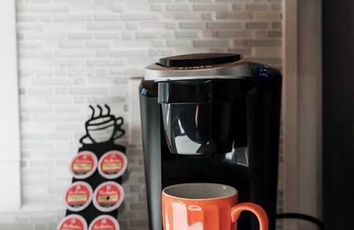 Enjoy a well-equipped kitchen featuring a gas range stove and oven, toaster, Keurig, traditional coffee maker, full set of dishes, pots and pans, a spacious island, and a cozy dining area—perfect for home-cooked meals and morning coffee.