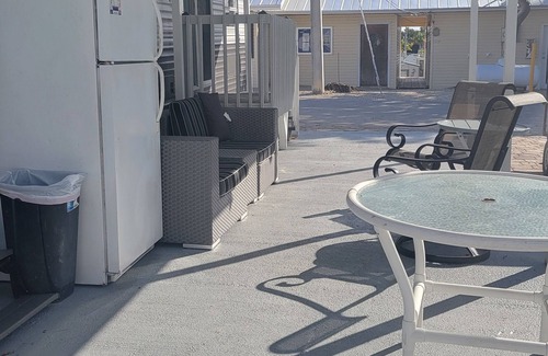 This trailer has an additional guest bedroom with bunk beds. 2 adults fit comfortably in lower bunks. The top bunks are for children only. The kitchen is stocked with a microwave, refrigerator, stove, oven, pots and pans, and tableware. There is a fish cleaning stainless steel table outside for your convenience. There is space on the lot to park your boat (boats only 18' and under, width of parking spot is approx 9'. Please check prior to make sure it fits on the lot as it is a requirement, if it does not fit, the association will not allow entry). A gas grill and/or charcoal grill are available for your use.