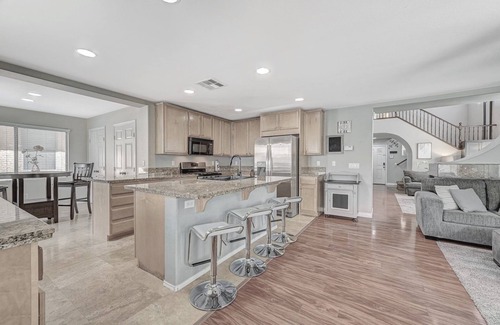Spacious 4 bed/3 bath home-1 bed/bath downstairs, Large kitchen, 2 living rooms + upstairs loft & spacious bedrooms! The comforts of home with the Vegas strip close by. Tucked away in a quiet cul-de-sac to relax after a fun filled day on the town! 4.2 miles to the Airport. Many nearby casinos, shopping & restaurants.