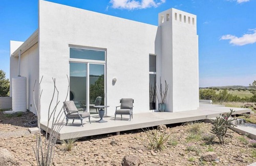Kingfisher is a custom-built Hebel block home featuring a king-sized bed and a comfortable sofa bed accommodating up to four people. Modern, clean lines in the home are vastly contrasted with the secluded rustic views of the Glass, Fort Davis, and Del Norte Mountains. A large wide deck with seating allows for astonishing scenery no matter the time of day or night. The pristine and fully-equipped kitchen with Corian counters is the perfect size to prepare your own meals or just refill your glass of wine. Kingfisher is a guest home located on the same property as the owner’s home; however, there are no sight lines between the homes. Guests will enjoy complete privacy during their entire stay.