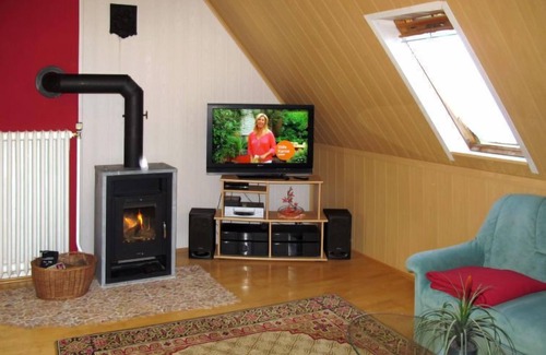 2-room apartment 50 m2, on the top floor. Practical furnishings: living/sleeping room with sloping ceilings with 1 double sofabed, Scandinavian wood stove, satellite TV, radio, CD-player and DVD. 1 room with sloping ceilings with 1 french bed. Kitchenette (4 hot plates, oven, toaster, kettle, microwave, electric coffee machine) with dining table. Shower/WC. Gas heating. Facilities: children's high chair, baby cot (extra). Internet (WiFi, free). Please note: non-smokers only. Smoke alarm.