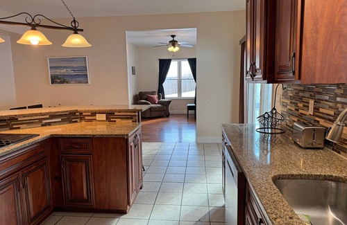 Inside this large home, you will find plenty of space for your group to spread out and enjoy. There is a large 1st-floor living room with a uniquely shaped corner of windows, comfy seating, a SmartTV, and a connected bonus room with a piano. A spacious kitchen is perfectly located between the covered back porch and the formal dining room. Whether you choose to eat outside or in the dining room, you'll be just steps away from the kitchen.