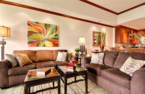 Kolea 15J has spared no expense with upgraded travertine floors throughout the living room, exquisite artwork, and beautifully tiled kitchen walls. The villa comes with cable, wireless internet and long distance calling to the 50 states. This is not your average vacation rental. And of course each room has a ceiling fan and there is central air conditioning. The villa also has a washer and dryer.