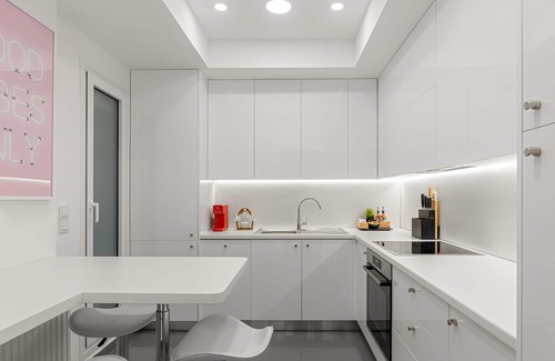 The Kitchen, with a space of its own, boasts a sleek grey and white palette with integrated appliances and everything you will need for your very own cooking sessions. It also features a slightly higher table (with 4 stools) for a more casual meal or quick coffee before you begin your day roaming the Greek capital.