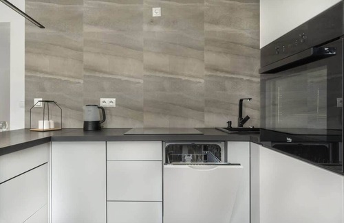 The studio apartment is located on the third floor and is designed for two people. It is an ideal option for a couple or solo travelers. The decor is minimalist and the color scheme is based on the proven combination of gray, black and white. Two accommodations are made in the living room on a double sofa bed. You can prepare a delicious meal using the induction cooktop located in the kitchenette, as well as the oven and microwave. You shouldn't have to worry about washing dishes either, as a dishwasher is also at guests' disposal. In the bathroom you will find a shower, towels and a washing machine, which will certainly come in handy during longer stays. The apartment is suitable for those working remotely - the living area has a desk with a chair, and a high-speed WiFi connection is available throughout the studio. Additional multimedia equipment includes a flat-screen TV. The balcony is private. The place is pet-friendly, and guests traveling with their pets are welcome.