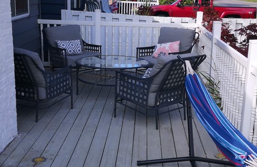 The two large decks on the front and back of the property will have you in the sun all day long including the dining table outside, 2 hammocks, a lounge set, a conversation set and a tiki bar!