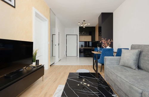 The flat, finished in an elegant style, can accommodate 4 people on an area of 40 m2. The interior consists of a living room with a double sofa bed, a kitchenette, a separate bedroom with a double bed and a bathroom. From the living room there is access to the balcony, where you can sit on the comfortable armchairs and let yourself relax while enjoying a cup of coffee. The kitchen area is equipped with all the necessary kitchen utensils, allowing guests to prepare delicious home-cooked meals. Both the kitchen area and the living room are furnished with black furniture, which, combined with gold elements, create a coherent composition, giving the interior a classic and modern look. The facility's space is functionally designed, meeting all the needs of guests. Amenities include multimedia equipment (flat-screen TV and free Wi-Fi). In addition, an iron, ironing board, hoover and washing machine are available in the flat. The bathroom has free toiletries, a towel and a hairdryer. A separate bedroom with a desk provides guests with privacy and creates a comfortable environment for remote working. The flat comes with a private parking space on a platform in the underground garage.