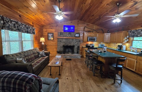 Open floorplan boasts smart TV above the rustic stone fireplace, fully stocked kitchen & island bar, kitchen table, 2 smart TV's, & ceiling fans. Rocking chairs on front porch, Grill on the back deck with BBQ and patio set. Roast marshmallows for smores around the fire pit while stargazing.
