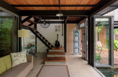 The property is designed by the owner who is an Architect and it has won few awards and published locally and internationally. The house is situated infront of a lake and a jungle . An urban hideout with calm and quiet surrounding . It has two rooms for booking and owners architecture studio and his quarters are in the same premises . The common spaces such as living , dining and pool can be used by guests .