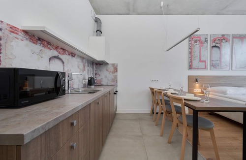 The stylish and air-conditioned studio is located on the 2nd floor of the historic building ''PIEKARNIA Żywa Kultura'' on Księcia Witolda Street in Wroclaw. This is the site of a former garrison bakery, where there are residential spaces, as well as art galleries, theaters, art and advertising studios. The complex also features a garden and a unique collection of contemporary artworks. This renovated, remodeled building, both inside and outside, has retained its former industrial character - decorative elements, details or art objects are present on the staircases, individual floors, doors or facades of the building.