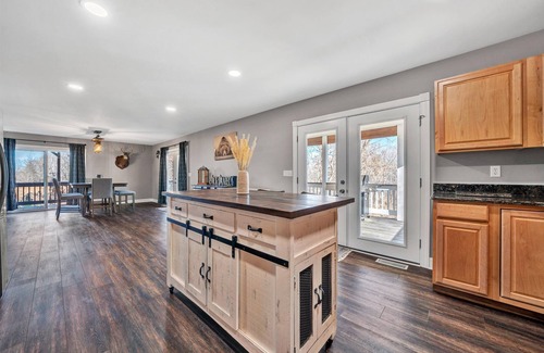 This lovely 3 bedroom, 2 bath house has plenty of space inside and out for relaxing and enjoying the countryside while being less than 5 minutes to boat ramps for you to enjoy a day on the lake. It offers a very spacious dining and entertaining area or enjoy the large sectional outback on the covered deck with firepit and new grill. The front porch offers four rocking chairs with whiskey barrel tables to take in the wildlife of the area and wooded views. It also offers two more decks on the side of the house for a private outdoor area. The main floor has a queen bed and one bathroom shared with main floor. The upstairs bedrooms have king beds a shared bathroom and there is an upstairs sitting area/office desk as well.