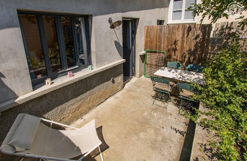Studio with independent access located on the ground floor comprising an entrance, a bathroom (shower), separate WC, a living room-kitchen (combined microwave oven) with 1 double bed 140x190 cm opening onto a closed terrace . TV with free Molotov / Disney / Netflix apps. Private parking in the fenced property. Possibility to store bicycles in the shed in common with the owner. Former personal workshop of the owner's grandfather, converted into 2 adjoining gites, attached to the main house. Residential area on the heights of Chambéry (line 4 of the Chambéry urban network stop 100 m away). Studio pleasantly arranged and equipped for 2 people with all-inclusive services. Terrace in an enclosed courtyard, with table and deck chairs, facing south.