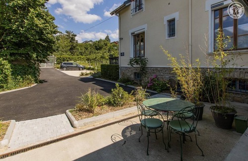 Gite with independent access located on the ground floor comprising a living room-kitchen lounge area (television with free Molotov / Disney / Netflix apps), 2 bedrooms (1 double bed 140x190 cm / 1 double bed 140x190 cm), a bathroom water (shower), separate WC with washbasin. Private terrace. Private parking in the fenced property. Possibility to store bicycles in the shed in common with the owner. Former personal workshop of the owner's grandfather, converted into 2 adjoining gites, attached to the owners' main house. Residential area on the heights of Chambéry (line 4 of the Chambéry urban network stop 100 m away). Gite pleasantly arranged and equipped, in a contemporary spirit. Terrace with table and deck chairs, west facing.