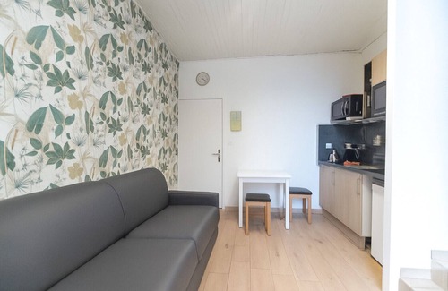 Located on the 1st floor of a quiet residence, this 13 m² studio apartment has been completely refurbished and is ideal for a two-person stay in the heart of the village. Enjoy a functional and comfortable space: a main room with sofa bed, television, dining area and a shower room with WC. The kitchenette is equipped with everything you need to prepare your meals: electric hob, fridge, oven, microwave and crockery.