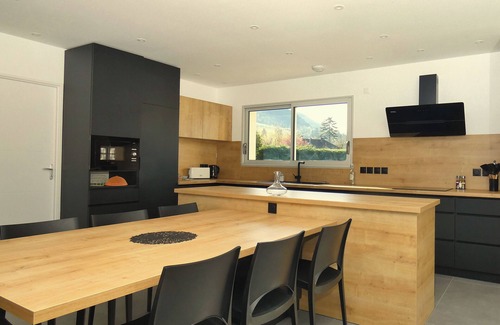 Bright living room : living room with large-screen TV, large dining table, fully-equipped open kitchen (oven, microwave, induction hob, coffee maker, kettle, toaster)