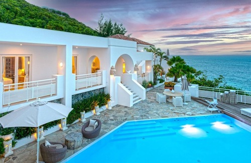 Villa L'Oasis, represented by Exceptional Villas, is located at the far end of Baie Rouge, one of St. Martin’s most sought after beaches. This villa sits alongside the cliffs offering incredible sea views and luxurious surroundings. Built on three levels, following the incline of the cliff, this elegant and sophisticated beachfront home has six bedrooms, including 3 master suites and two beautiful pools, one at shore level and a second overflow pool on the main residential level. With its clean architectural lines and pristine white walls, villa L'Oasis offers oceanfront living at its best, with the sun and surf of a world-class beach, endless water vistas, and elegant and comfortable interiors.