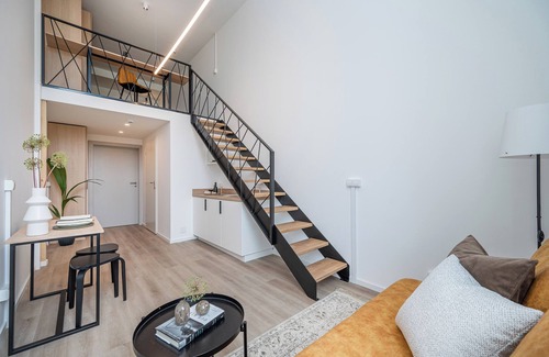 A more spacious, more comfortable loft with stairs to the mezzanine. There is a sleeping area with a 140x200 bed, a wardrobe, and a work area. The green area and the park can be seen from the windows.