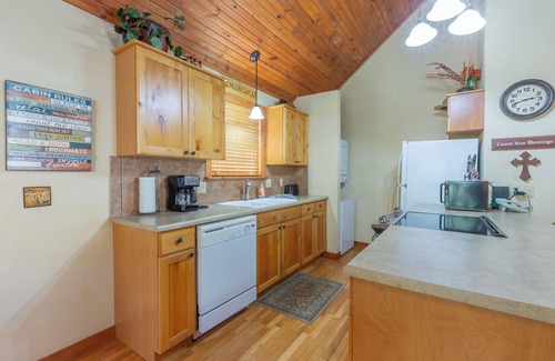 This unique, beautiful, and spacious lodge has an interior & exterior unlike any other. Upon entry to this two-bedroom lodge you'll immediately notice the high wood ceilings and open floor plan. Both bedrooms are master suites with attached private master bathrooms. The bedrooms have a king size bed, an arm chair, and satellite TV. The private bathrooms have a large Whirlpool tub and walk-in shower. The living room has a large flat screen television with satellite TV, fireplace, two arm chairs, queen size sleeper sofa, and wireless internet. The kitchen and dining room are open the living room. The kitchen is equipped with an oven, stove, microwave, dishwasher, full sized refrigerator, garbage disposal, coffee maker, toaster, and includes a washer and dryer. The dining room has a table with chairs for six. There is seating for three more at the bar in the kitchen. The large screened-in back deck is accessible from the dining room and has a patio table and four patio chairs.