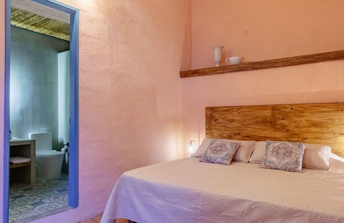 The house, with a high ceiling and rammed earth walls, has capacity for 8 people, accommodated in 3 large rooms with bathroom and air conditioning. And a romantic and cozy social area with an outdoor jacuzzi.