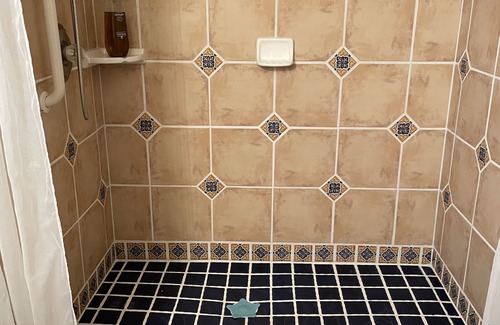 The bathroom has a beautifully tiled walk-in shower. A shower bench seat is available. Fresh linens & towels provided.