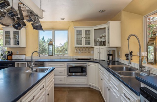 You’ll feel as though you are on holiday in Tuscany when you drive through the gates of La Conac - this stunning 3400 square foot retreat offers an unparalleled experience of opulent comfort in Murphys, the Queen of the Sierra. With panoramic views of the picturesque foothills, this property is designed to provide a serene escape in the heart of Calaveras County’s renowned wine country. La Conac is a custom straw-bale built home reminiscent of an Italian villa - the 4 bedrooms and 3.5 bathrooms provide ultimate relaxation for your family and friends. Enter to the tastefully appointed main level where you’ll find the elegant living room with fireplace, spacious dining area, and gourmet chef’s kitchen complete with Corian counters, a large island, and stainless steel appliances. Also on the main level are 2 bedrooms, a full bathroom, half bathroom, and laundry room. Upstairs, discover the enchanting primary suite with gorgeous bathroom (boasting a soaking tub, tile shower, and dual sinks) - plus a private balcony with sweeping views of the hills. Also upstairs is another bedroom and additional luxurious bathroom. Step outside to discover gorgeous manicured landscapes and a pillared pergola covered in dreamy wisteria, where you can enjoy your morning coffee or an evening glass of local wine while taking in the breathtaking vistas. The expansive lawn is ideal for leisurely afternoons, and the bocce court invites friendly competition and fun for all ages. The garage has been thoughtfully converted into a recreation room, adding even more entertainment options to your stay. Whether you're exploring the nearby vineyards and charming town of Murphys, hiking the scenic trails, or simply unwinding, your stay in Murphys will be nothing short of unforgettable. Come and experience the ultimate blend of sophistication, comfort, and natural beauty at the exquisite La Conac!
