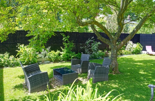 a 200m² private garden with garden furniture, table, deck chairs and barbecue.