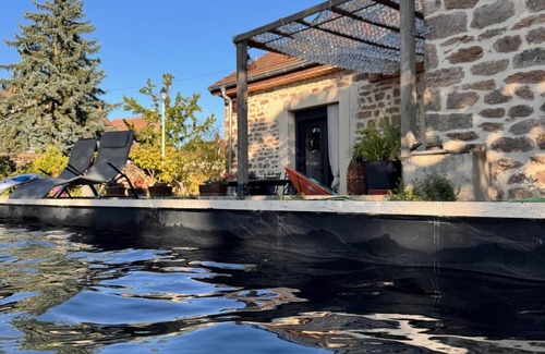 Charming authentic old "fournier" from the 19th century (traditional bread oven), very carefully restored, nestled in the heart of a small typical agricultural village (rich with a beautiful Romanesque church from the 12th century located a stone's throw away) perched on an exposed hill, at the foot of a very old volcano (the "Volcan de Drevin", culminating at 494 m). Soothing rural and preserved natural setting, nestled on the immediate edge of a vast plateau of meadows (with the peaceful Charolais cows as neighbors...), in the hollow of the gentle rolling Creusot countryside, a succession of valleys of hedged farmland surrounded by wooded hills, bucolic fish ponds (including the vast fishing pond of Brandon with an area of 48 ha nearby) and deep wild forests to explore on foot or mountain bike (many panoramic "belvederes"). Very comfortable gîte. Warm, contemporary character enhanced by a meticulous "ethnic" decor inspired by the owners' various travels (between Asia, Madagascar, Jordan, and the Maghreb). Plenty of charm. A cozy, comfortable, and cocooning atmosphere. A large, exposed and shaded terrace opens onto a pleasant little natural garden featuring an imposing cherry tree, surrounded by centuries-old dry-stone walls, and a rare heated "natural swimming pool." Magnificent unobstructed views of the surrounding countryside and the majestic medieval Brandon Castle (a listed 12th-century building steeped in history) in the background. Composition: Semi-detached house to the owners' home (complete independence). Wi-Fi. Electric heating + wood-burning stove. Ground floor: living room-kitchen-lounge, bathroom (shower/toilet). 1st floor: mezzanine bedroom (double bed 140x190cm), bedroom (2 single beds 90x190cm which can be twinned into a double bed 180x190cm), separate toilet. Private terrace + garden + parking. Heated swimming pool (3x10m) with natural swimming pool (private use during dedicated hours from 10:30 a.m. to 8 p.m.). Supermarket 6 km. All amenities 8 km. Please note: the TGV line passes nearby.