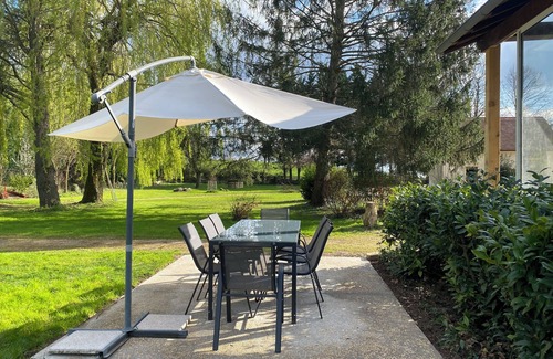 Set in the château courtyard, enjoy the surrounding park, shared pool and views over the countryside from the outdoor dining area.