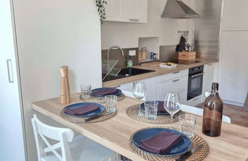 -> A dining area and a fully equipped kitchen (stove, hood, microwave, oven, fridge, dishwasher, toaster, coffee maker, kettle…). Everything you need to cook is provided. A welcome kit is offered, including tea, coffee, sugar, and biscuits.