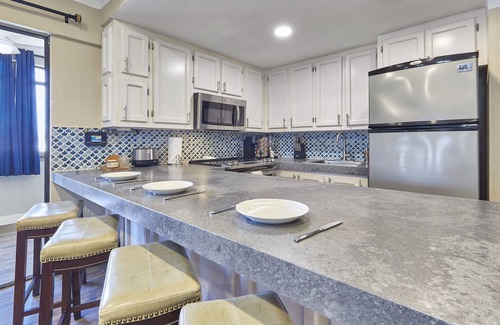 The La Mansion Penthouse features a remodeled kitchen with purified water, dining for 10, remodeled bathrooms, full size washer and dryer, smart TVs in all rooms, and individual AC thermostats and ceiling fans in every room for maximum comfort for every guest.