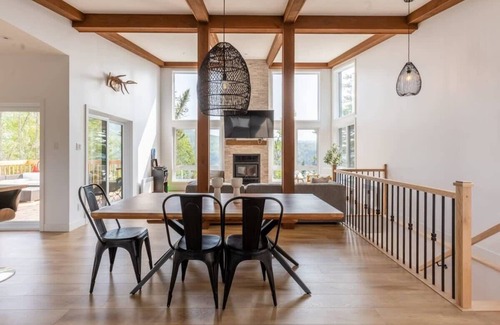 Immerse yourself in the surrounding beauty as soon as you step through the door. The stunning lake backdrop is enhanced by the warm architecture of the chalet. Floor-to-ceiling windows flood the space with natural light, offering an impressive panoramic view of the lake.