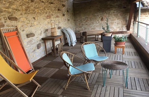 Both nature enthusiasts, Marie & Patrice welcome you to an authentic 19th century barn of character - carefully restored & enhanced by a gentle contemporary extension - linked to the old neighboring country farmhouse that they occupy today , also elegantly renovated. Calm & tranquility on the edge of a small alley, in the heart of a typical picturesque little town, with exotic charm & notable heritage (15th century church, astonishing washhouse in the shape of a Greek temple, traditional Burgundian houses, several mansions, etc.). Nestled in the countryside on the edge of fields & meadows, once famous for its pink stone quarries (used in the construction of many eminent buildings in Burgundy, including the elegant, world-famous Romanesque abbey of nearby Tournus), this former wine-growing village enjoys a splendid unspoilt countryside & natural setting, nestled between the banks of the Saône and the Bois de Fouget, a vast forest sheltering the La Truchère Nature Reserve, a unique biotope in Burgundy, rich in an astonishing variety of environments (sand dune , marshy pond, wooded peat bog, fresh forests…), magical landscapes as well as a rare animal & plant ecosystem. Comfortable cottage. Warm country character with contemporary accents. Zen & soft atmosphere. Exceptional large sheltered panoramic terrace upstairs. Lovely enclosed garden, carefully planted with trees, vegetated & very flowery, a literal intimate green setting totally bucolic & soothing, located at the foot of the gîte. Composition: Semi-detached village house adjoining the owners' home (total independence). Wireless. Electric heating. Ground floor: living room-kitchen-lounge (double convertible sofa bed 140x190cm), separate toilet. 1st floor: bedroom (double bed 160x200cm) with bathroom in open space (bath). Sheltered terrace + private parking. Enclosed garden shared with owners. Local bikes. All amenities 4.5 km.