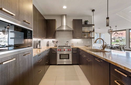 La Vista Encanto #14 is a former Parade of Homes showcase located in a gated Ivins community, just across from Black Desert Golf Course and only 2 miles from Tuacahn Amphitheatre. This 4-bedroom retreat with two private casitas features stunning views, elegant finishes, and access to resort-style amenities, including a year-round heated pool and hot tub, fitness center, pickleball courts, and a chef’s kitchen for the ultimate blend of luxury and comfort.