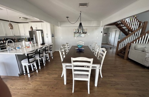 Welcome to this stunning 7 bedroom, 3.5 bath beach house on the lagoon with an added powder room with a sink! Enjoy an extended family vacation sipping wine watching the sunset over the waterfront. First floor contains a queen bedroom with a Jack and Jill full bath adjoining into a family room for family fun night with two couches one being a queen sleeper sofa!, living room, dining room, island kitchen with separate breakfast nook as well as a sunroom overlooking the water and a half bath. The second floor contains the master suite (king sized bed with master bath with a steam shower), 4 bedrooms with queen size beds and a perfect kids suite which is 2 adjoining rooms. One of the adjoined rooms has a bunk bed (twin over full) and a separate twin. The second adjoined room has a bunk bed (twin over full), the full bath and the powder room with a sink. The house has been renovated and has all brand new plush mattresses, brand new furniture, brand new appliances, and 9 brand new TVs. Second floor also boasts amazing water view off a small nook where you can play board games, read a book or just relax. Off of that is an outdoor balcony.