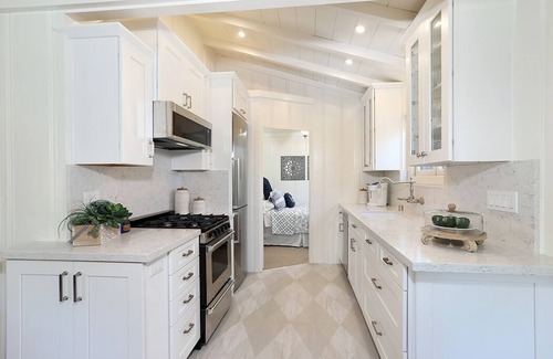 This newly remodeled Private Cottage is perfectly located with a short walk to the Beach in the Heart of Laguna Village amongst beautiful palms and a lush mature garden. Open Beam Ceilings with a modern cottage charm all the rooms are bright and sunny. 2 bedrooms and 2 baths (additional office room can sleep 2 more), brand new kitchen, expansive deck perfect for lounging with coffee all the way thru the day to a beautiful sunset, then star filled evening dining in… Or walk to Laguna’s many wonderful restaurants within just a few blocks. Off the master suite is a lovely private yard under mature palms for an additional turf area with lounge chairs, lots of privacy or great for hosing off after a day at the beach. The expansive deck off the kitchen has a BBQ, comfy and new all-weather wicker sectional for hanging out and a large eating table for 6. All surrounded by a beautiful tropical garden. 3 blocks to great Surfing Beaches, walk to Summer Park Concerts, and Laguna Village from this Charming Cottage. The free trolley stops just across the street, perfect for hitching a ride to the famous Pageant of the Masters, Sawdust Festival, or the many Laguna Art Museums. Very Private Home and comfortable, clean, with all new everything. Beach chairs, umbrella, beach towels, wet suit, Surf Board, and Boogie Boards, bed linens and bath towels. Games and movies on demand from the HD SmartTV. High speed wire-less internet. Across the street is quaint Nita Carmen Park, public swimming pool, tennis courts and running track.