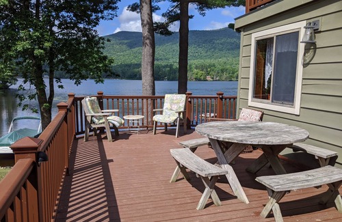 Scenic year-round, 4 bedroom home situated on Lake Algonquin in Wells, NY nestled on a quiet lake cove. Great for vacationing with multiple families. Conveniences close by without sacrificing peaceful relaxation. You and your guests will enjoy our wrap around deck, screened in porch, and cozy sunroom with incredible views of the lake and mountains. Outside, you can enjoy our boat dock or pull up an Adirondack chair to the outdoor firepit and roast some marshmallows while listening to the peaceful ambience of the Adirondacks. Newly renovated upper deck off the lakefront bedroom. Enjoy your coffee in the morning or your wine in the evening on the upper deck off the master bedroom.