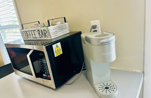 The main bedroom has a queen bed and glass doors that open up to the private balcony. The living room has a queen futon as the second bed. You can comfortably fit 3 adults and the space is still the perfect size for 2 adults and 2 children. We provide your morning coffee with a Keurig, customized coffee station, and k-cups.