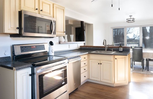 What was once a small log cabin, which was built in the mid 1800's to be servant's quarters, has been updated and expanded over many years. It is now a beautiful and relaxing century lake home with huge ALL SEASON hot tub/swim spa perfect for families and friends to enjoy scenic views and time away together. Yes it is useable all winter! Outfitted with games, a full kitchen, grill, firepit, serene views and wildlife. Three bedrooms host up to 8 adults. Also a sofa, loveseat and futon in the living room could accommodate a few young kids. There are two full baths as well and spacious decks and common areas to provide all the personal and gathering space you need. Lots of towels and basics provided.